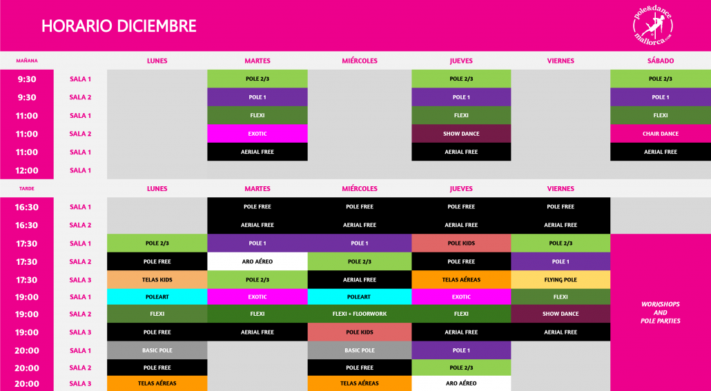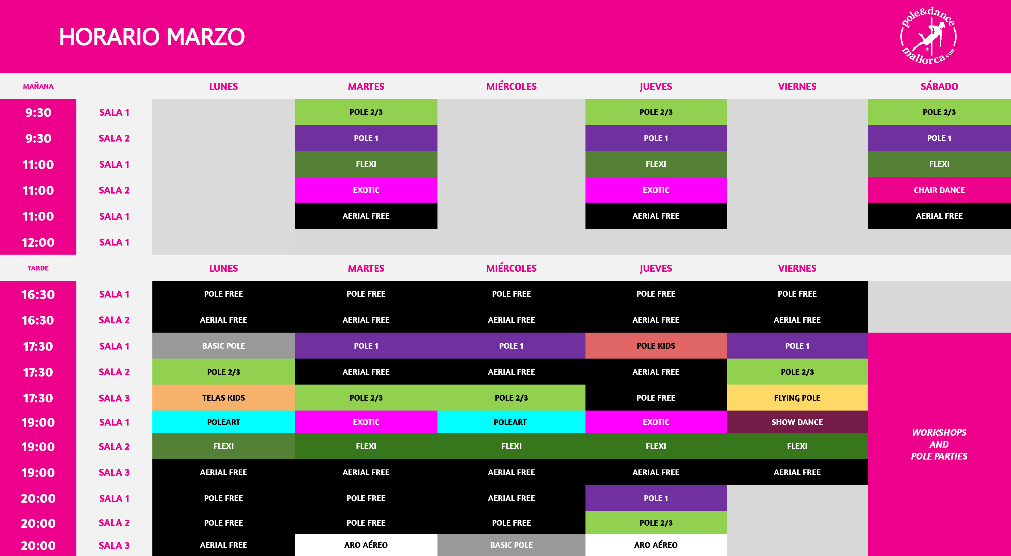 Las clases de Pole&Dance Mallorca se dividen en 4 niveles en el que cada estudiante aprende figuras apropiadas para el nivel de dificultad. En otras clases tipo Flexi, Aereos, Showdance, Yoga, no se requieren ciertas habilidades y por lo tanto no hay divisiones de niveles.