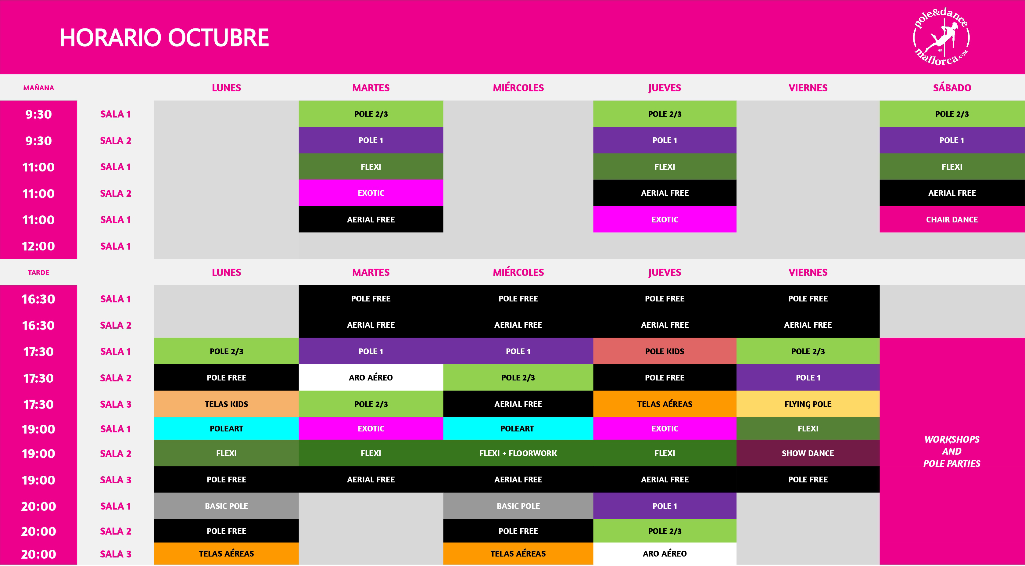 Vestuario: Short, camiseta, toalla grande, trapito pequeño para limpiar la barra y tu propia esterilla (medidas provisionales por higiene). En el caso de aéreos puedes venir con leggins y en algunas clases de baile con tacones (Exotic o Burlesque) y zapatillas de deporte limpias en Twerk. Obligatorio quitarse los zapatos en la entrada y depositarlos en el zapatero.